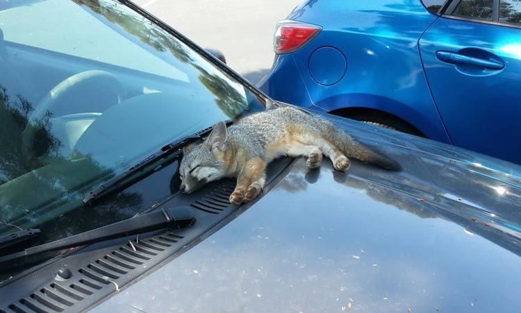 Лисёнок, заснувший на капоте автомобиля