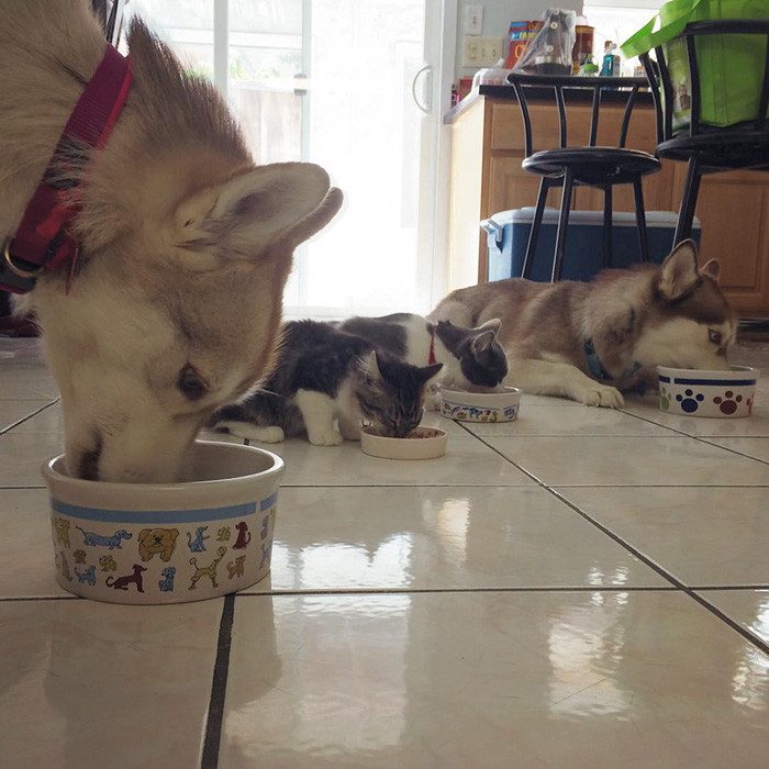 Хаски спасли от смерти котенка. Теперь они лучшие друзья