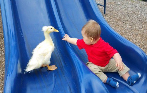 В домашнем хозяйстве этой техасской семьи — 11 уток. «Когда Тайлеру было 9 месяцев, муж поехал покупать корм для уток и увидел Бикера, – рассказывает мать Тайлера, Дженнифер. – Он купил утёнка, привёз домой, и с того дня Бикер практически не отлучается от Тайлера. Если Би слышит, что малыш плачет, он сразу бежит к нему, громко при этом крякая».