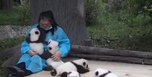 Возможно, это самая милая и лучшая в мире работа: ухаживать за маленькими пандами, готовить для них еду, кормить и, конечно же, вот так, сидя в вольере, весь день обниматься с пушистыми медвежатами!