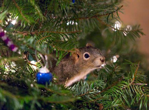 Спасённый бельчонок Миттен, живущий на рождественской ёлке