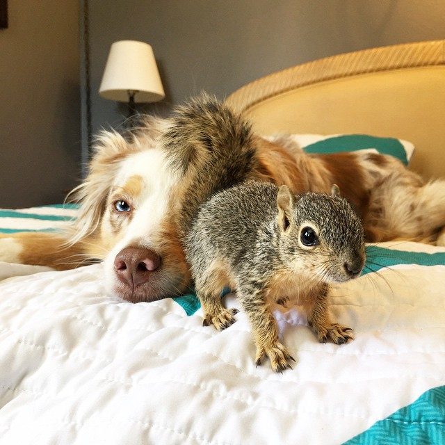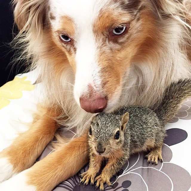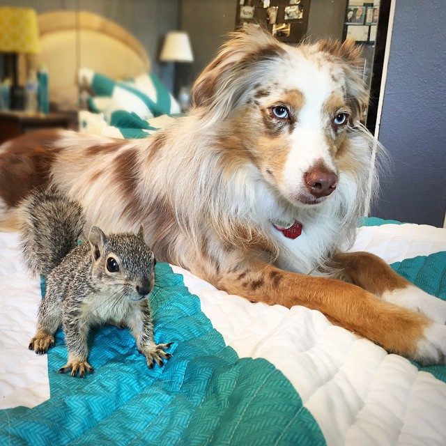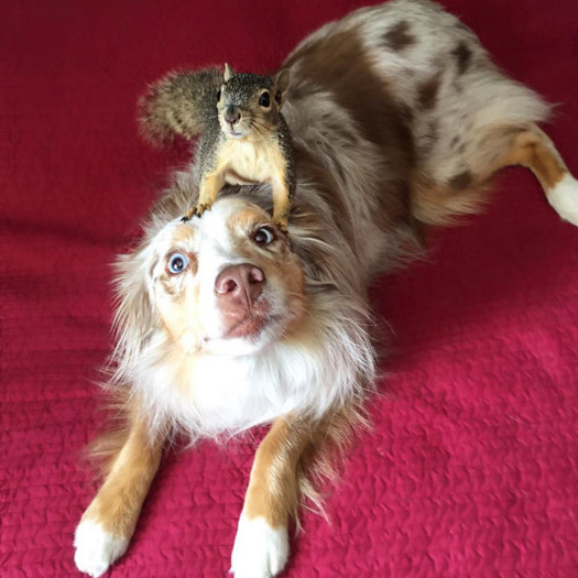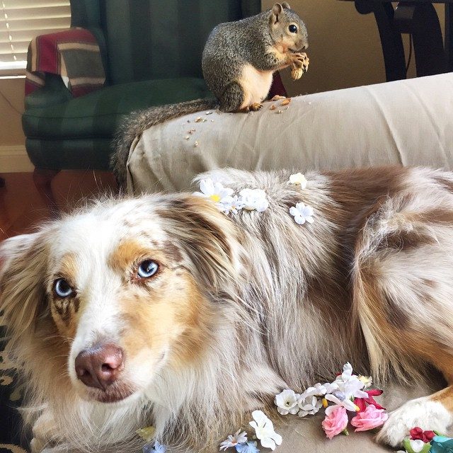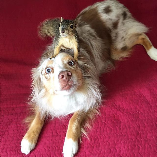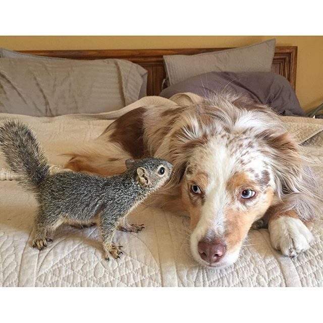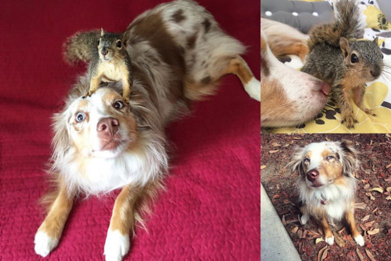 Калли и Стюарт, австралийская овчарка и белка — лучшие друзья