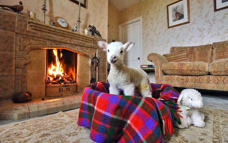 Ягнёнок в доме у фермерши Элисон Лэмб в графстве Дарем в Англии. Овца не смогла справиться со своими тремя новорожденными ягнятами, поэтому один из них теперь живёт в корзинке для собаки в гостиной у камина.