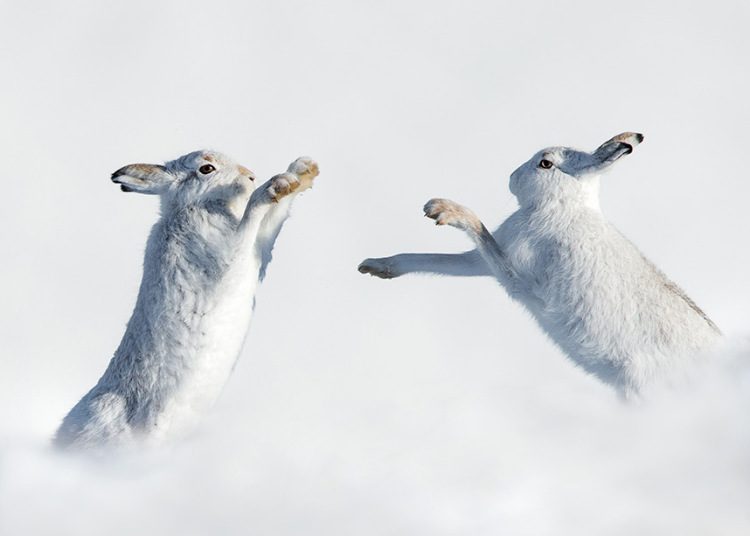 Дерущиеся зайцы в горах Кайрнгорм в Шотландии.