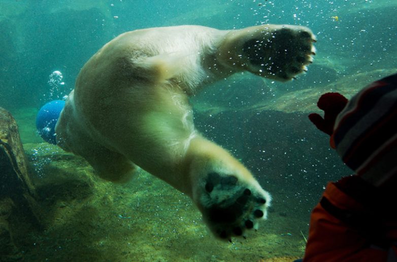 Белый медведь играет в бассейне в Шёнбруннском зоопарке в Вене в Международный день белого медведя.