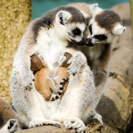 Самка кошачьего лемура со своими новорожденными детёнышами в парке дикой природы The Wild Place Project, который является филиалом Бристольского зоопарка, в Англии.