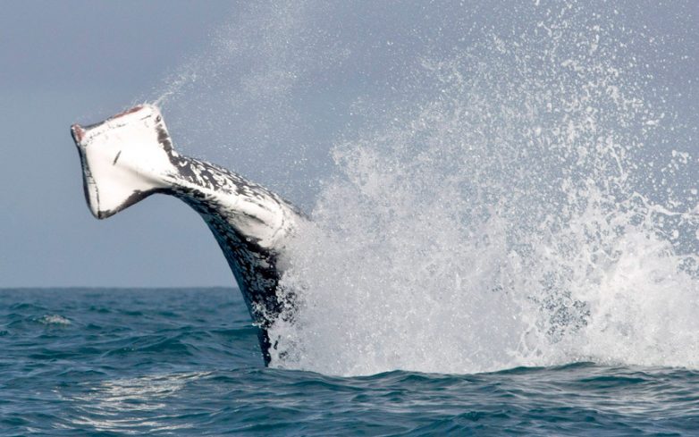Горбатый кит с повреждённым плавником плещется у берегов Каикоуры в Новой Зеландии.