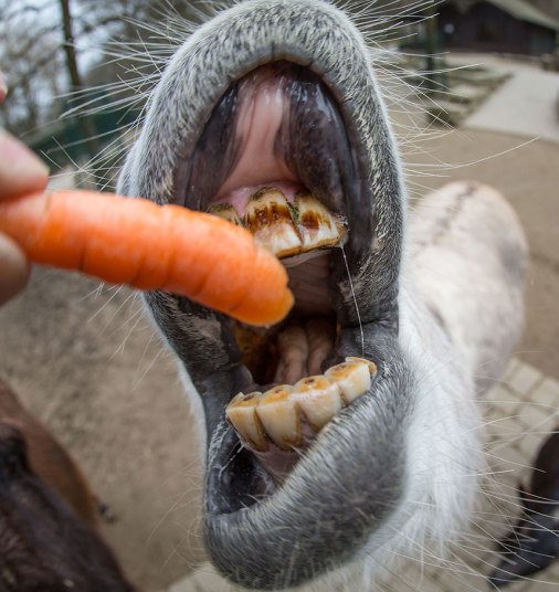 Посетитель Зоопарка Опель угощает осла морковью в Кронберге, Германия.