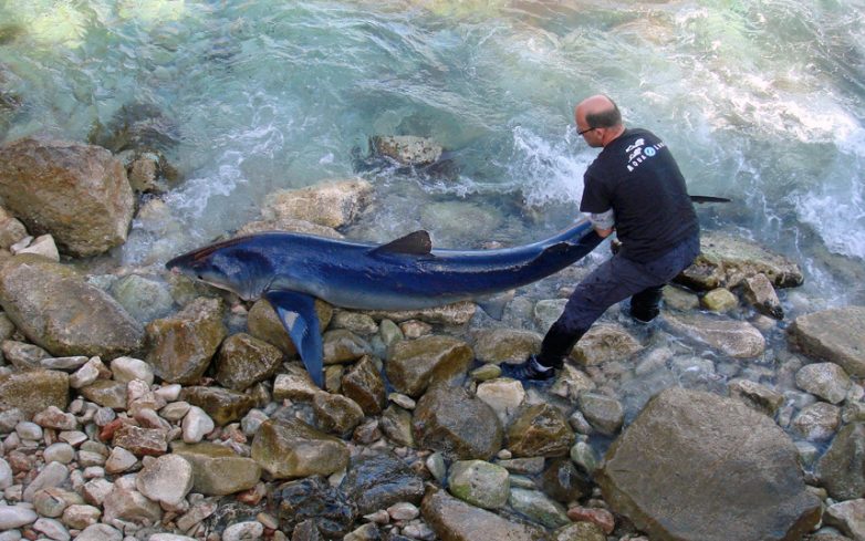 Основатель благотворительной организации Sharklab-Malta британец Грег Новэлл спасает акулу, которая оказалась на мелководье у побережья Пемброка на Мальте.