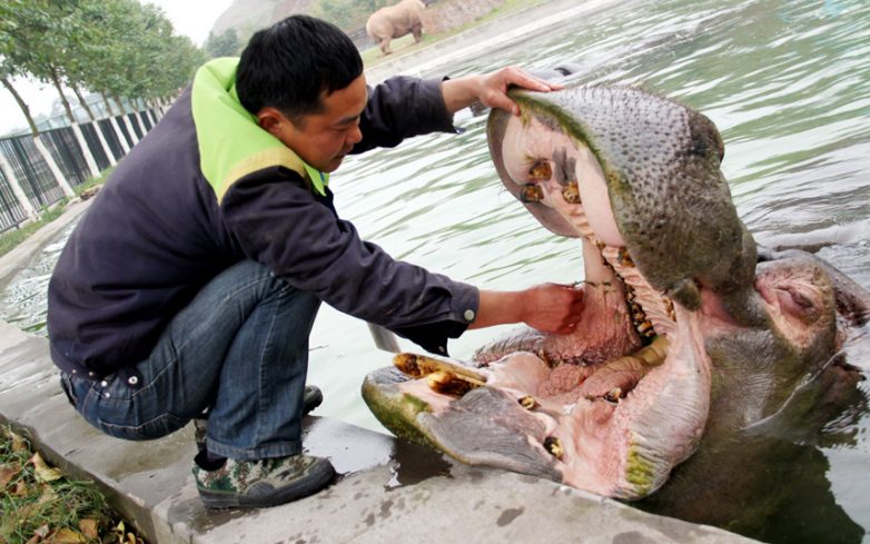 Работник зоопарка Chongqing Wild Animal World Чунцине вынимает траву, застрявшую между зубов у бегемота.