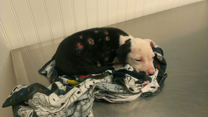 Щенок обгорел почти весь, включая подушечки лап. Он получил ожоги 75% тела