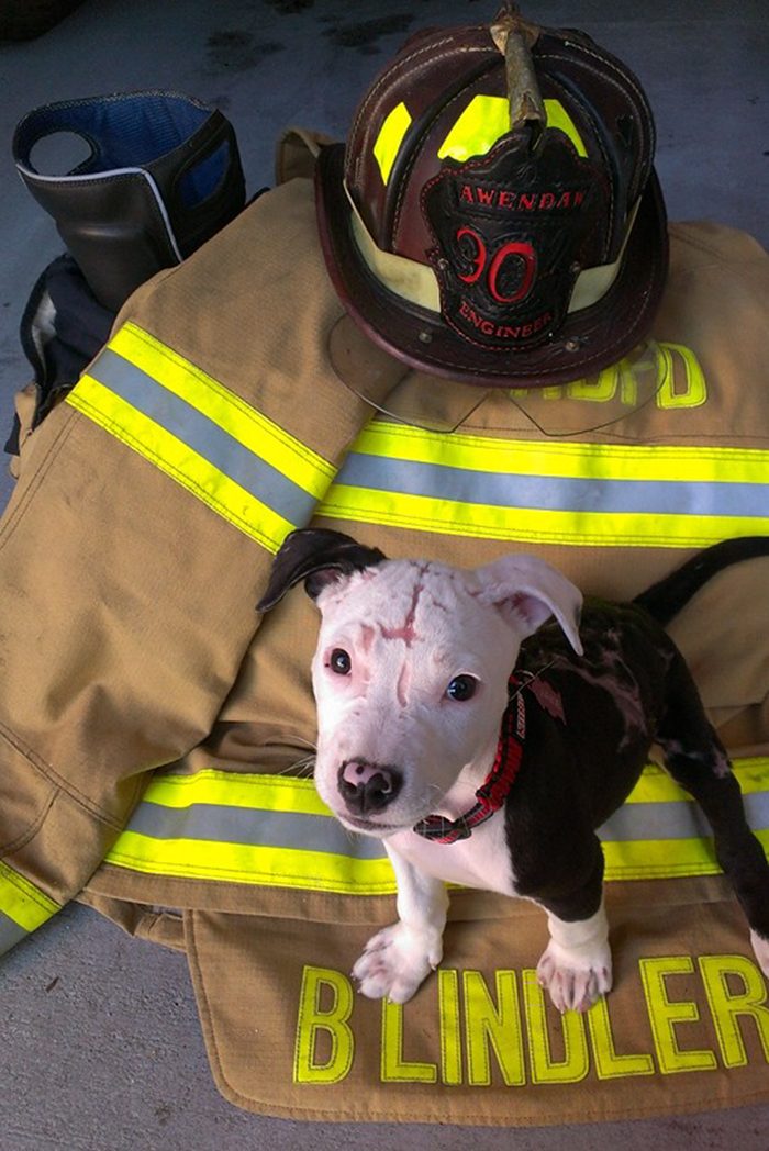Ему повезло: его вытащил из огня пожарный Уильям Линдлер, но щенок сильно пострадал, получив ожоги 75% тела. Вскоре хозяева Джейка бросили его в ветеринарной клинике, так как им нечем было платить за лечение. К счастью для щеночка, его решил забрать тот самый пожарный, что спас ему жизнь. Окруженный любовью и заботой в пожарной части города Ханахан (Южная Каролина, США), Джейк быстро восстановился. Он стал официальным талисманом пожарных и теперь они берут его с собой на занятия по пожарной безопасности, которые проводятся в школах города. На этих занятиях детям рассказывают о том, как предотвратить пожар и что нужно делать в экстренном случае. У Джейка даже есть собственный значок пожарного! «Думаю, было бы здорово сертифицировать Джейка как собаку для терапии детей, получивших ожоги при пожаре. Чтобы они играли с ним и понимали: жизнь продолжается даже после таких ужасных вещей, и Джейк тому подтверждение. Ведь он очень сильно пострадал, но посмотрите на него – какой красавец.»