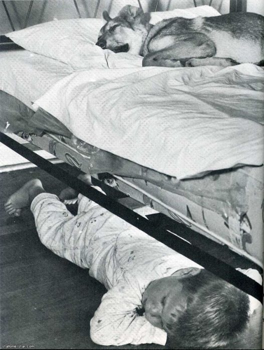 Мальчик уступил свою кровать собаке, а сам занял ее место.