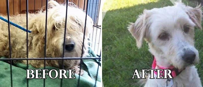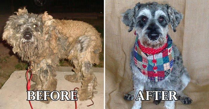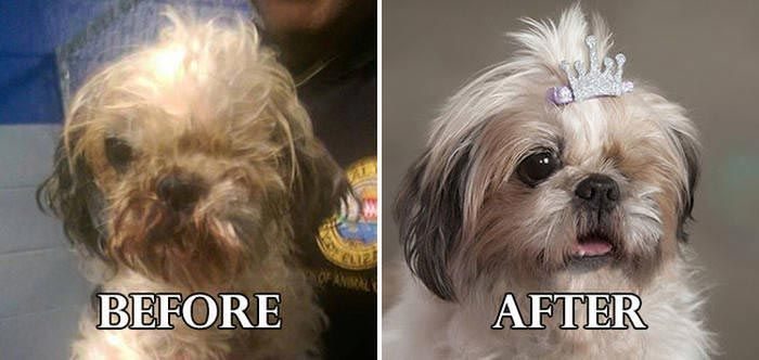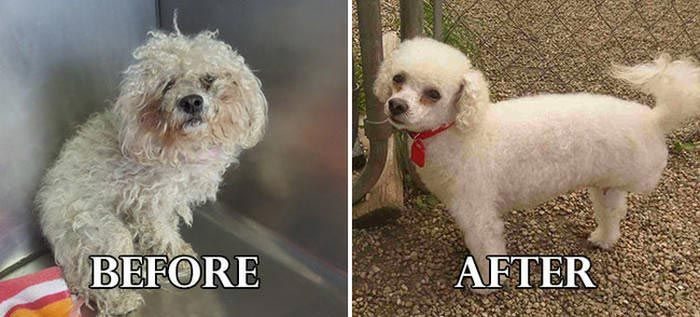 Но всё изменилось, когда они были найдены добрыми людьми, которые отмыли их от грязи, состригли все свалявшиеся колтуны и нашли ми новый дом. Трудно поверить, что собаки на фотографиях справа, когда-то было тем, что изображено на кадрах слева.