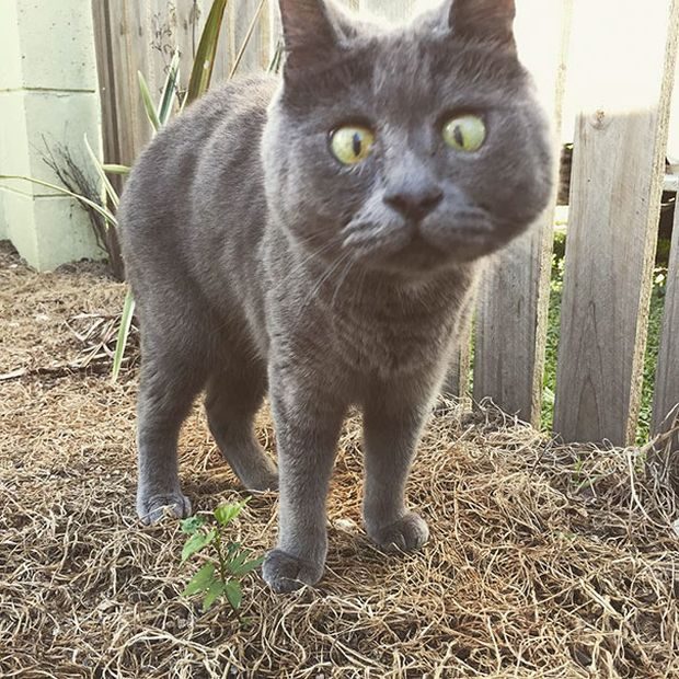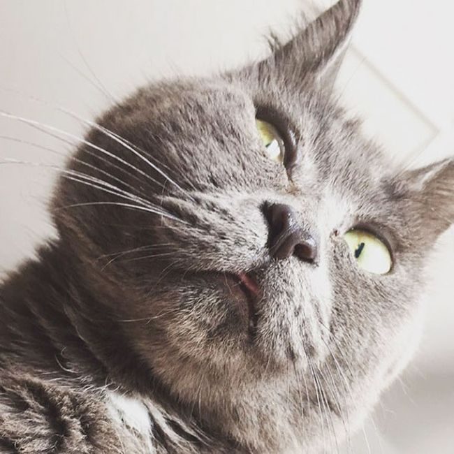 Этот необычный кот, породы русская голубая, выглядит, так как будто он постоянно удивлен, но на самом деле это последствия заболевания — гидроцефалия головного мозга.