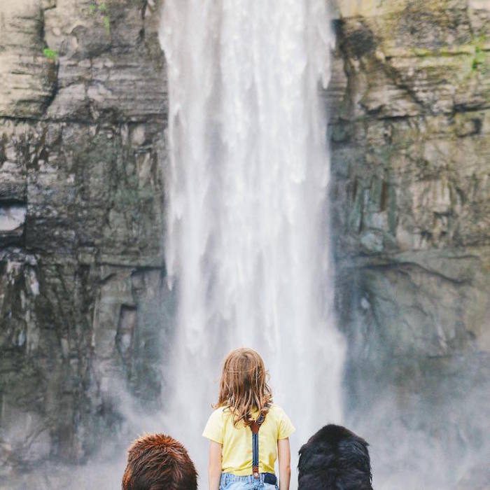 Джулиан с двумя домашними ньюфаундлендами у водопада.