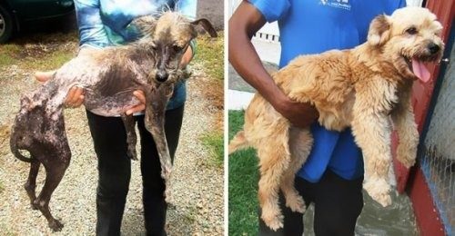 Облысевший от стресса и тощий от недоедания, бедняга Сидер выглядел невероятно несчастным до тех пор, пока его не взяли домой. Теперь трудно поверить, что на этих двух фотографиях — один и тот же пес!