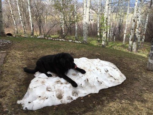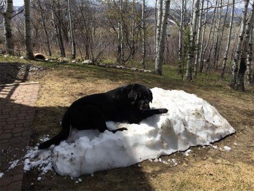 Зимой любимым занятием пса было лежать во дворе на куче снега, однако с приходом тепла снег начал потихоньку таять, и любимая куча с каждым днём становилась всё меньше и меньше.