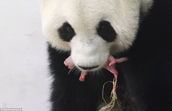 Аккуратно держа новорожденного малыша в пасти, панда Хао Хао как будто с легкостью вжилась в роль матери.