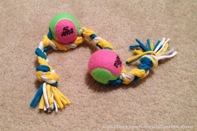 Любая собака просто обожает играть в перетягивание каната. Вот такую игрушку вы с легкостью можете сделать из старых футболок и теннисных мячиков.