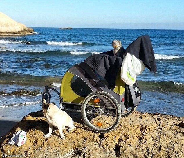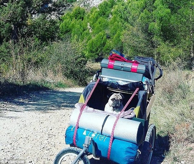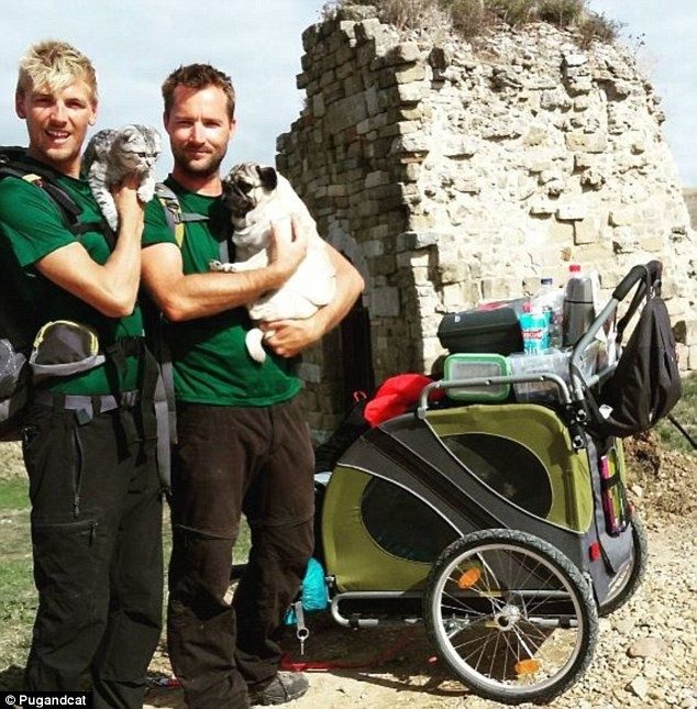 Животные путешествуют в специальной собачьей коляске, поэтому веселой компании — кошке, собаке и их хозяевам Себастиану и Финну — удается без проблем преодолевать длинные дистанции.