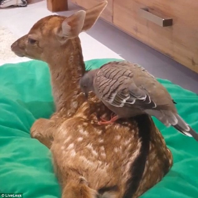 Австралийка по имени Джесс из Сиднея приютила олененка, оставшегося сиротой после того, как его мать убили охотники. Малыш уже успел найти себе друга: он весело проводит время с хохлатым голубем, который также живет у Джесс.