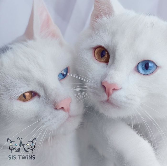 Так вот, у наших сегодняшних подружек-сестричек по кличке Айрисс и Эбисс именно такая особенность — и у одной и у другой кошки глаза разного цвета, при этом они близняшки: обе белоснежного цвета и имеют один глаз оливкового цвета, а второй — цвета голубого топаза.