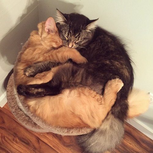 С тех пор, как они появились в этом доме приёмными котятами, эта «кровать» была их любимым спальным местом. И теперь, когда они повзрослели и увеличились в размерах в несколько раз, перестав вдвоём помещаться в своей любимой кровати, их всё равно ничто не останавливает! Они лучше будут тесниться в обнимку друг с дружкой, чем пойдут спать в какое-нибудь другое место!