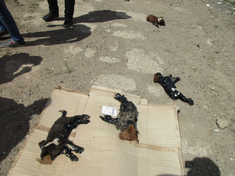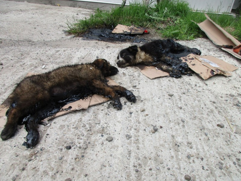 В Румынии прохожие обнаружили на улице четырех щенков. Кто-то облил их гудроном и оставил умирать.