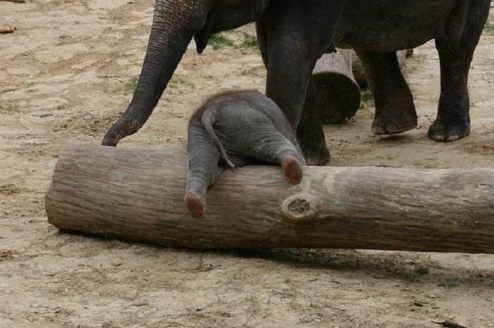 Новорождённый слонёнок изучает местность.