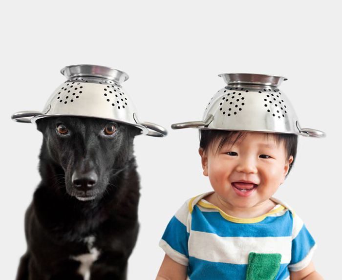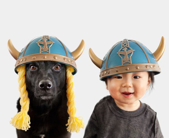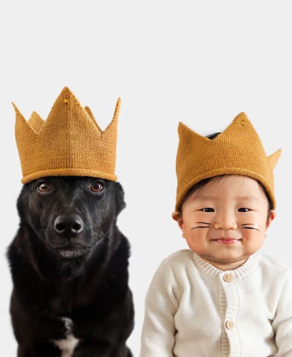 Фотографии малыша и его четвероногого друга в одинаковых головных уборах