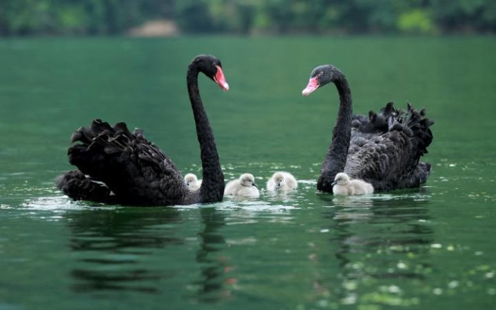 Пара черных лебедей со своим выводком на озере в Чжанцзяцзе в провинции Хунань, Китай.