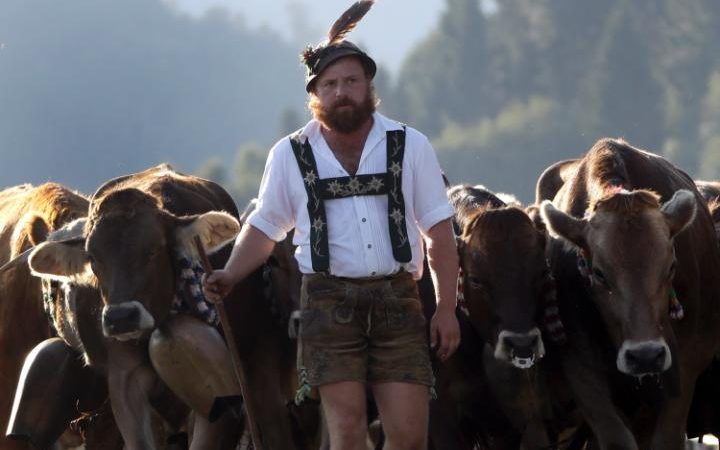 Баварский пастух в национальной одежде перегоняет скот с летних пастбищ в горах близ Оберштауфена, Германия.