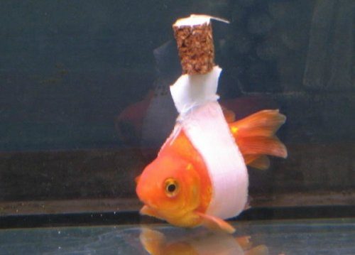 Правда, это не в прямом смысле «инвалидная коляска», а специальное плавающее устройство, которое с помощью пробки и лямок помогает рыбке плавать в правильном положении.