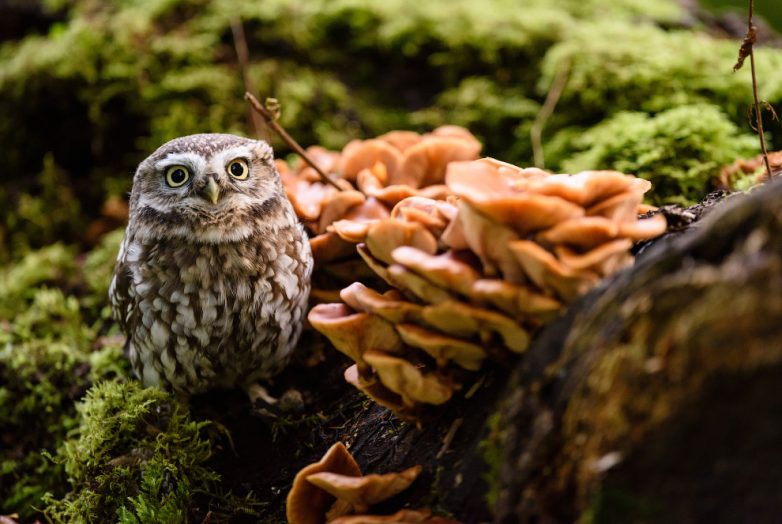 Грибник. Домовой сыч среди грибов в лесу в Йоркшире, Великобритания, 4 ноября 2016.