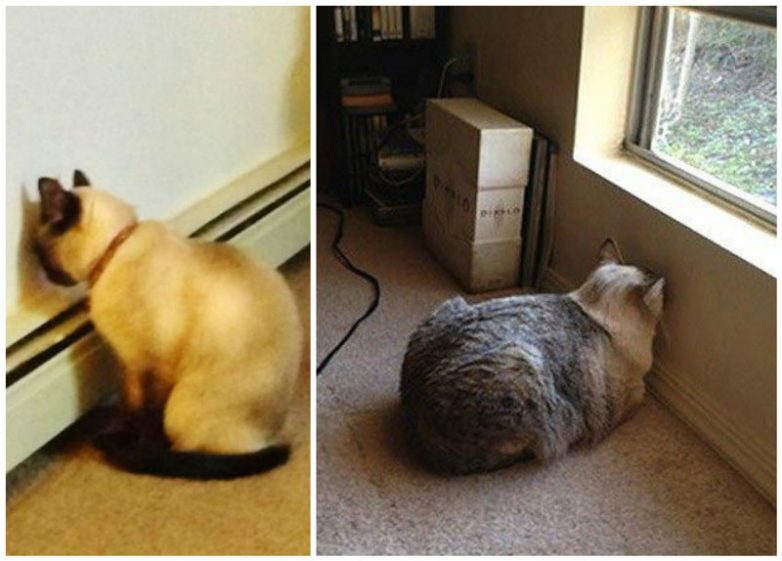 Говорят, что когда кошки упираются во что-то лбом, то это значит, что они пытаются избавиться от головной боли. Не болейте, котики, лучше пообижайтесь...