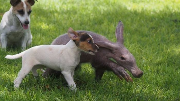 Попавший в приют для животных осиротевший детеныш трубкозуба по кличке Джерти нашел утешение благодаря собакам породы джек-рассел-терьер, которые приняли его, как своего щенка.