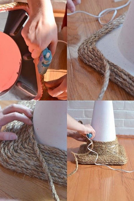 Шаг 2: начиная с подставки, наматывайте на конус бечёвку. Каждый слой обрабатывайте клеем.