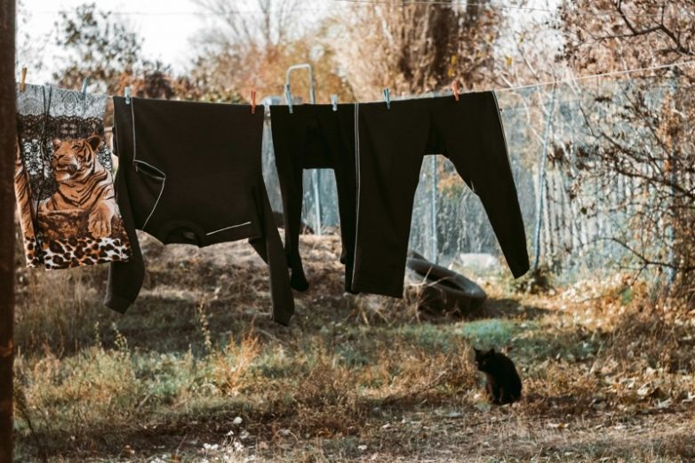Собирательный образ двора из девяностых: бельё, развешанное во дворе, полотенце с тигром, поросшая травой покрышка, кот. ВАЗ-2106 в кадр почему-то не попал. Разгуляевка, Волгоградская область.