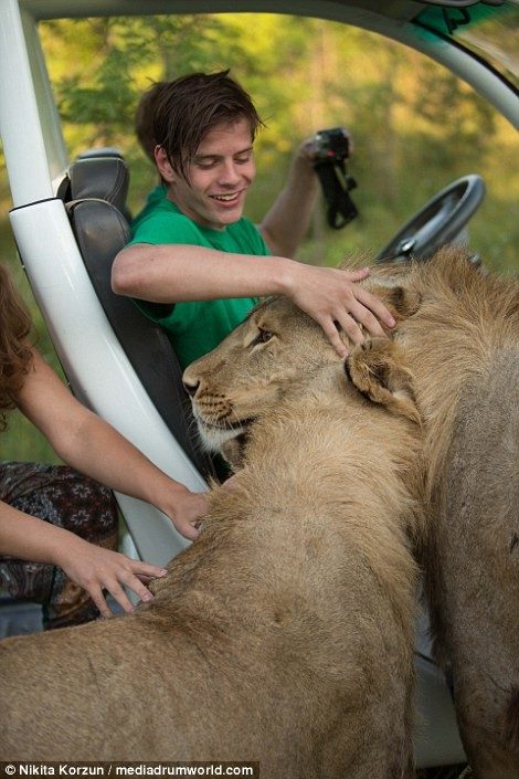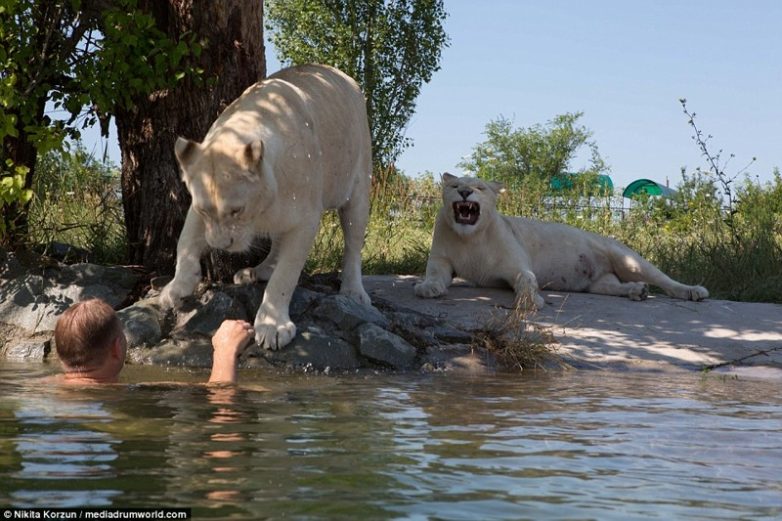 На фото, сделанных Никитой Корзуном, гигантские кошки весом в пару центнеров, ласково трутся о ноги своего друга, позируют для фото, целуют людей в губы. А одна белая львица даже протягивает когтистую лапу помощи мужчине, купающемуся в пруду.