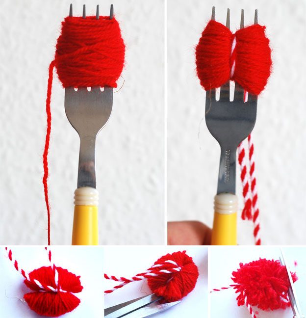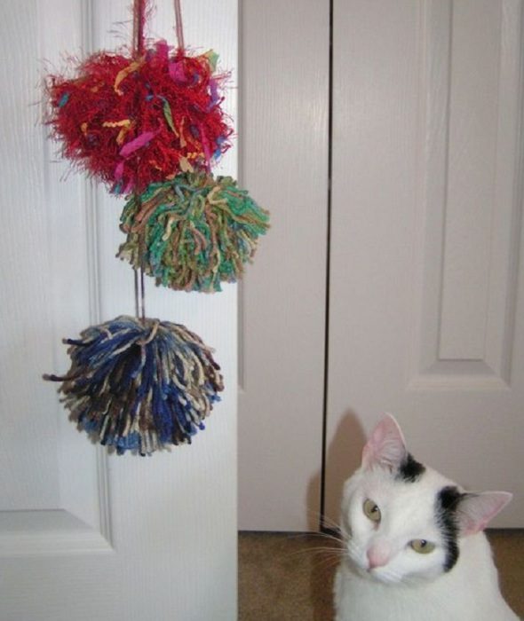 Помпоны на ниточке – любимая игрушка многих котов, которая не надоедает им долгое время. Готовые игрушки можно подвесить на дверной ручке, чтобы кот пытался достать их.