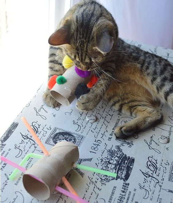 В основе от рулона туалетной бумаги проделайте несколько отверстий в хаотичном порядке. Проденьте сквозь них коктейльные трубочки, яркие лоскутки или помпоны. Такая игрушка займет животное надолго.