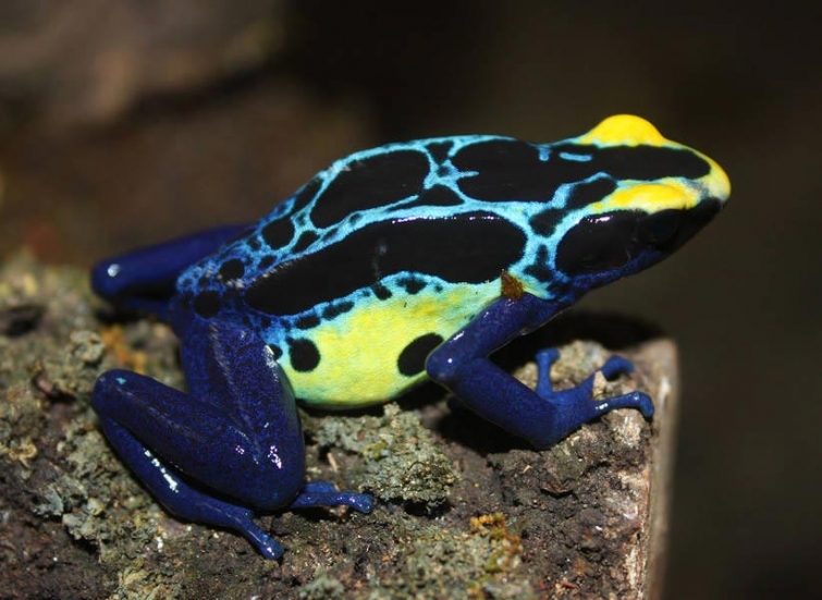 Эти симпатичные маленькие лягушки населяют лесные просторы тропиков Коста-Рики и Бразилии. Необычный яркий окрас поражает обилием оттенков цветов: желтого, зеленого, синего и оранжевого. Яд этого лягушонка способен убить 2 огромных слона или 20 человек! Зафиксированы случаи смерти человека лишь от прикосновения к этой милому созданию. Занимательно, что в неволи пятнистые древолазы прекращают выработку яда, из-за того, что в пище нет особых видов насекомых, которые требуются для этого процесса.