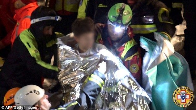 Среди спасенных в отеле было несколько детей. Эдуардо ди Карло был в игровой комнате, когда сошла лавина. На фото спасатели выносят его из-под завалов.