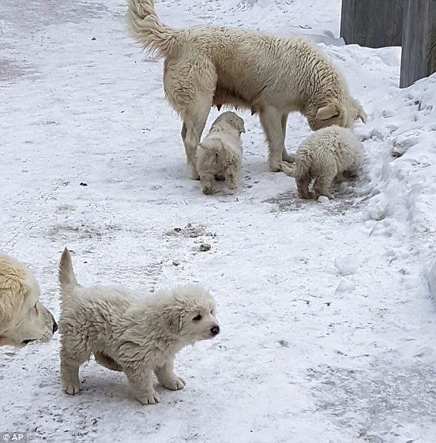 Белоснежные щенки пастушьей овчарки родились в декабре. Они вместе с постояльцами оказались под 60 тысячами тонн снега, превратившие отель в развалины в среду.
