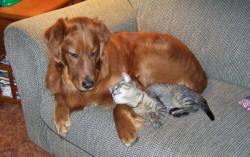 Как же жаль мленького собакина, спрятавшегося за маму- кошку !!!(((