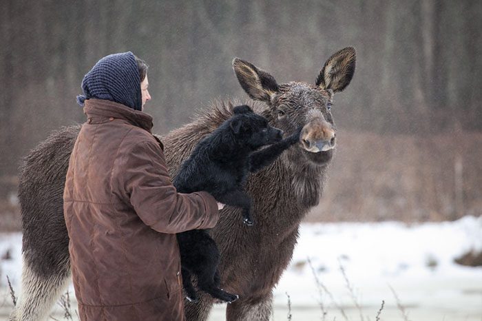 Такого необычного питомца встретишь нечасто – лось Гриша значительно выше своей хозяйки, но при этом совершенно неагрессивный и по нраву больше напоминает собаку.