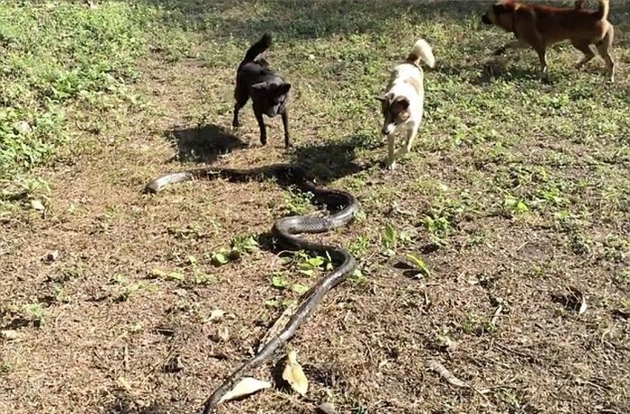Четыре храбрых пса тут же набросились на змею, пытаясь вытащить её за пределы участка.