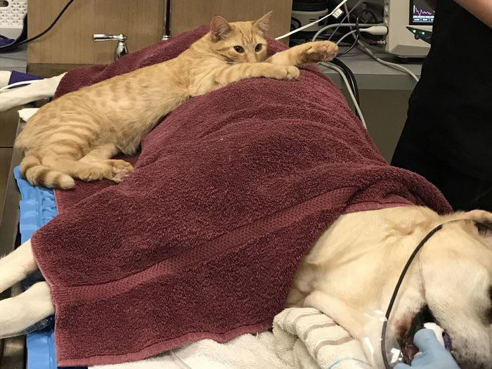Он прижимается к любому из животных, которые находятся под наркозом — к примеру, для работы дантиста, не требующей стерильности — и согревает их теплом своего тела. Он даже по-своему ухаживает за пациентами, рассказывают ветеринары.