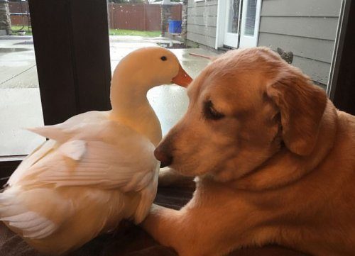 По словам владельца животных, когда пёс и селезень вместе, они гоняются друг за другом или пытаются друг на друга запрыгнуть, но когда врозь, то им всегда друг друга не хватает.